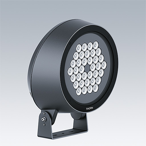Projecteur architectural de taille Large Monté sur étrier avec LED alimentées en 1050 mA et un faisceau medium. Driver, gradable DALI-2. Classe électrique II, IP66, IK08.