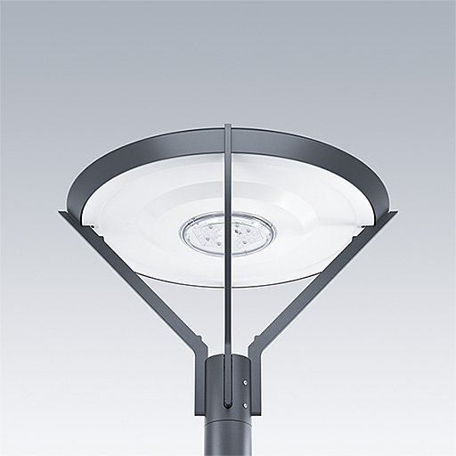 Lanterne décorative à montage top avec 18 LED entraînés à 350mA et une optique confort symétrique radial avec un minimum de lumière vers le haut.. Classe électrique II, IP66, IK08. Base et bras : aluminium Moulage sous pression (EN AC-46000), chapeau : aluminium tourné, gris anthracite 900 sablé texturé. Diffuseur : Polycarbonate (PC) transparent. Fixations à visser : Acier inox. Équipé d’un presse-étoupe. Protection contre les surtensions : 10 kV en mode commun single pulse et 8 kV en mode commun multipulse; 6 kV en mode différentiel multipulse. Si un système DALI est connecté: 6 kV en mode mode commun et mode différentiel multipulse. Livré avec LED 3 000 K