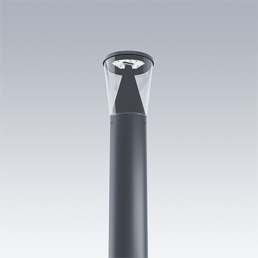 Lanterne poteau discrète avec 18, LED alimentées avec 250mA et distribution lumineuse de type Confort symétrique radial. Flux fixe Driver. Classe électrique II, IP66, IK10. Base : aluminium Moulage sous pression (EN AC-44300). Finition : aluminium thermopoudré, gris anthracite 900 sablé texturé. Diffuseur : Polycarbonate (PC) transparent stabilisé aux UV. Pré-câblé avec 3 m de câble.. Mât à commander séparément.
