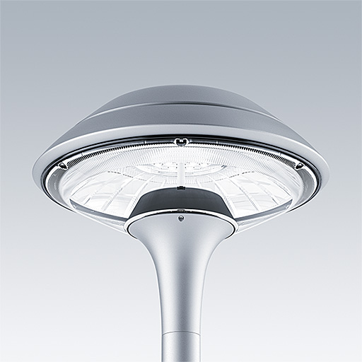 Plurio Direct : Lanterne LED décorative à montage top avec distribution Radialement symétrique. Driver avec 18 LED entraînés à 350mA. Classe électrique I, IP66, IK08. Base : coulé aluminium, thermopoudré gris argent. Chapeau : forme plat, aluminium, texturé gris argent. Diffuseur : anti-UV, transparent Polycarbonate (PC) avec prismes anti-éblouissement. Optique à lentille direct avec réflecteur interne Equipé d'un 50% circuit de réduction de puissance, qui entre en vigueur 3 heures avant et 5 heures après un minuit calculé. Il peut être désactivé à l'installation avec un interrupteur interne facilement accessible. Livré avec LED 4 000 K. Montage top sur mât de Ø 60mm.