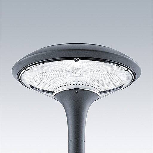 Plurio Indirect : Lanterne LED décorative à montage top avec distribution Radialement symétrique. Driver avec 24 LED entraînés à 700mA. Classe électrique I, IP66, IK08. Base : coulé aluminium, thermopoudré gris anthracite 900 sablé. Chapeau : forme disque, aluminium, texturé gris anthracite 900 sablé. Diffuseur : anti-UV, transparent Polycarbonate (PC) avec prismes anti-éblouissement. Optique à réflecteur indirect Equipé d'un 50% circuit de réduction de puissance, qui entre en vigueur 3 heures avant et 5 heures après un minuit calculé. Il peut être désactivé à l'installation avec un interrupteur interne facilement accessible. Livré avec LED 4 000 K. Montage top sur mât de Ø 60mm.