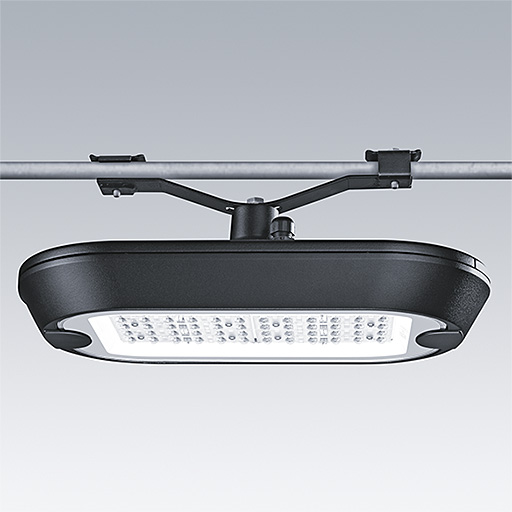 Une élégante lanterne urbaine architecturale et intelligente avec 48 LED alimentés en 500mA et une optique pour Confort pour rue large (symétrique) sans lumière vers le ciel. Electronique, non gradable. Classe électrique II, IP66, Résistance aux impacts : IK10. Corps et socle : Moulage sous pression aluminium (AS9U3, équivalent LM24, EN AC-46000) texturé noir (similaire à RAL9005). Fermeture : 6 mm d’épaisseur transparent verre. Pré-câblé avec 1 m de câble. Montage sur caténaire via 34G, luminaire perpendiculaire à la route. Livré avec LED 3 000 K.