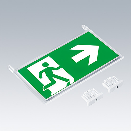 Cliquer sur le jeu de légendes avec une distance de reconnaissance : EN - 30 m pour convertir le luminaire Voyager One en panneau de sortie. Fourni avec un jeu de panneaux directionnels montables ISO 7010 (gauche, droite, haut, bas et vierge)